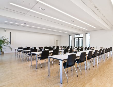 Viel Tageslicht, hochwertiges Parkett und helle Materialien machen ihn zum idealen Ort für Ihre Großveranstaltung. Zwei Hochleistungs-Beamer, eine hochwertige Lautsprecheranlage, Videokameras vorne und hinten, BluRay Player, WLAN – die Ausstattung mit modernster Technik lässt keine Wünsche offen. Optional stellen wir Ihnen gerne Rednerdisplays, eine Presse- oder Videokonferenzanlage und eine Sprechstellenanlage zur Verfügung. Durch den Einbau einer Hörgeräteschleife bietet unser Raum I ein Raum- und Kommunikationskonzept für Ihre gehobenen Ansprüche.